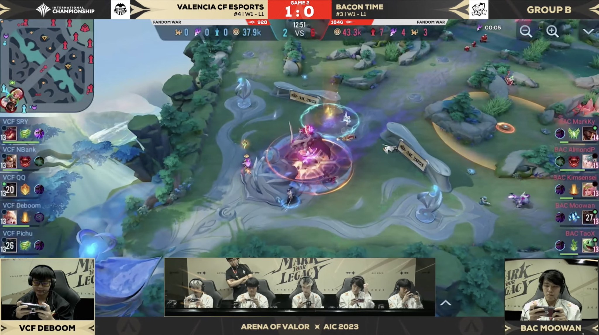 Valencia CF Esports เก็บชัยชนะเหนือ Bacon Time 2-1 ในศึกแห่งศักดิ์ศรีของ 2 ทีม อีสปอร์ตไทย ในทัวร์นาเมนต์ Arena of Valor International Championship 2023 หรือ AIC 2023 รอบกรุ๊ปสเตจ ที่เวียดนาม ทำให้ Valencia มีเพิ่มเป็น 2 คะแนน จากการชนะ 2 แพ้ 1 ขยับแซง Bacon Time ขึ้นมาอันดับที่ 3 ของสายบีแล้ว