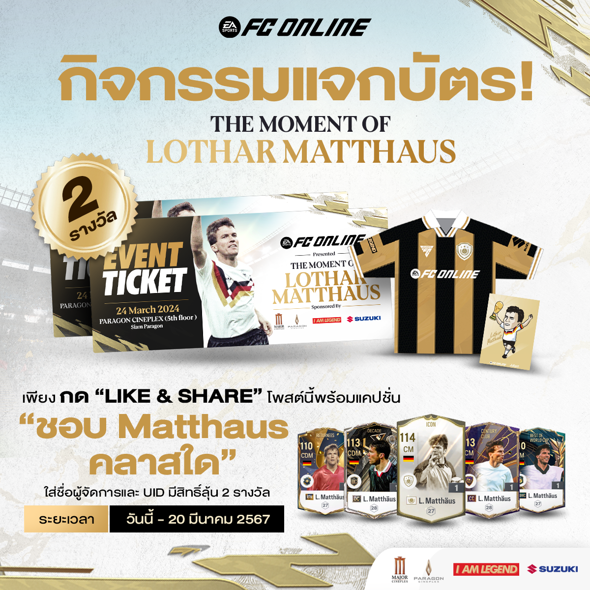 เกมฟุตบอล FC Online จัดกิจกรรมเอาใจแฟนเกมและคอบอลอย่างต่อเนื่อง ล่าสุดจัดงาน The Moment of “LOTHAR MATTHAUS” พาอีกหนึ่งตำนานนักฟุตบอลทีมชาติเยอรมันคนดัง อย่าง “LOTHAR MATTHAUS” เจ้าของบัลลงดอร์และลิเบอโร่คนสุดท้ายของวงการฟุตบอล มาเยือนประเทศไทย ณ PARAGON CINEPLEX (ชั้น 5 ) , Siam Paragon ในวันที่ 24 มีนาคม 2024 ที่จะถึงนี้