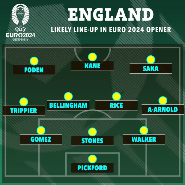 ขณะที่แดนกลางให้ เดแคลน ไรซ์ กับ คอเนอร์ กัลลาเกอร์ รับบทตัวรับยืนอยู่หลัง จู๊ด เบลลิงแฮม ที่จะคอยปั้นเกม ส่วนสามแนวรุกให้ บูคาโย่ ซาก้า ยืนฝั่งขวา ด้าน ฟิล โฟเด้น เล่นด้านซ้าย โดยที่ แฮร์รี่ เคน รับบทกองหน้าตัวเป้า