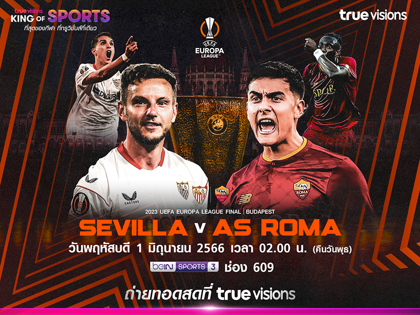 ทรูวิชั่นส์ ตอกย้ำการเป็นผู้นำคอนเทนต์กีฬาระดับโลก กับการถ่ายทอดสดศึกฟุตบอลถ้วยรายการใหญ่ ยูฟ่า ยูโรปา ลีก รอบชิงชนะเลิศ เซบีย่า ทีมแกร่งจากสเปน ปะทะ โรม่า ยักษ์ใหญ่จากอิตาลี สดจาก ปุสกัส อารีน่า กรุงบูดาเปสต์ ประเทศฮังการี เช้าตรู่วันพฤหัสบดีที่ 1 มิถุนายนนี้ เวลา 02.00 น.ทางทรูวิชั่นส์ ช่อง beIN Sports 3 (609)