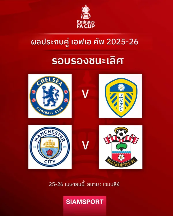 ผลการประกบคู่ศึกเอฟเอ คัพ รอบรองชนะเลิศ แมนเชสเตอร์ ซิตี้ พบ เซาธ์แฮมป์ตัน ส่วน เชลซี ปะทะ ลีดส์ ยูไนเต็ด โดยเตะที่เวมบลีย์ วันที่ 25-26 เมษายนนี้