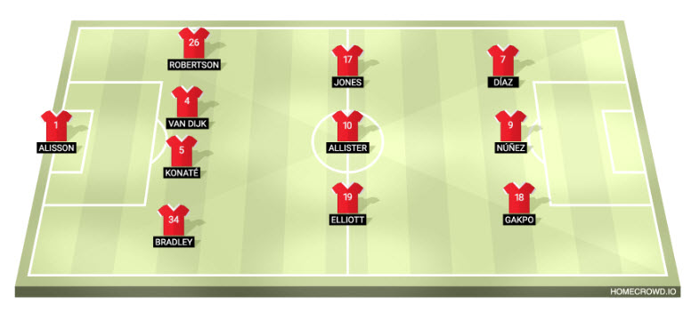 ด้วยการที่ยังไม่มี โมฮาเหม็ด ซาลาห์ ดังนั้น คล็อปป์ จึงไม่น่าจะมีการปรับเปลี่ยนแนวรุกจากเกมเมื่อกลางสัปดาห์ โดยให้ นูนเญซ เล่นหน้าเป้า ขนาบซ้ายและขวาด้วย ดิอาซ และ กัคโป ส่วน ดีโอโก้ โชต้า รอเป็นตัวทีเด็ดจากม้านั่งสำรองเหมือนเดิม