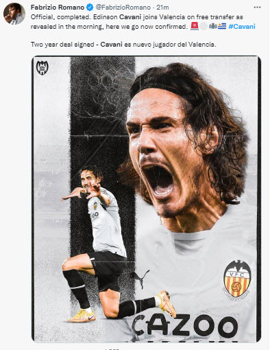 บาเลนเซีย สโมสรดังแห่งเวที ลา ลีกา สเปน ประกาศเซ็นสัญญาคว้าตัว เอดินสัน คาวานี่ กองหน้าประสบการณ์สูงทีมชาติอุรุกวัย มาเสริมทัพอย่างเป็นทางการ เมื่อวันจันทร์ที่ 29 สิงหาคม ที่ผ่านมา