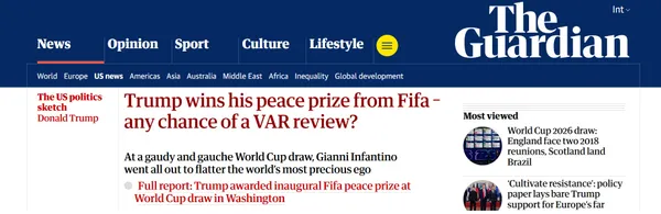ด้าน เดอะ การ์เดี้ยน สื่อชื่อดังของอังกฤษก็พาดหัวข่าวแบบเหน็บแนมว่า "ทรัมป์ ได้รางวัลสันติภาพจาก ฟีฟ่า มีโอกาสที่ วีเออาร์ จะช่วยตรวจชอตนี้ไหม ?" ด้วย ส่วนบางคนก็พิมพ์ตำหนิการออกแบบถ้วยรางวัล อย่างเช่น "ทำไมถ้วย FIFA Peace Prize มันถึงดูเหมือนโลกกำลังโดนลากลงนรกอ่ะ"