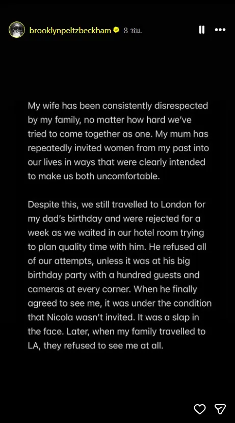 บรู๊คลิน เบ็คแฮม เปิดใจผ่านโซเชียล โจมตี เดวิด และ วิคตอเรีย เบ็คแฮม อย่างรุนแรง ยืนยันไม่คิดคืนดีกับครอบครัว ชี้ชีวิตหลังออกห่างมีความสุขและสงบมากที่สุดเท่าที่เคยมี
