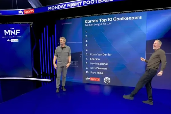 เจมี่ คาร์ราเกอร์ อดีตกองหลังลิเวอร์พูล จัดอันดับ 10 ผู้รักษาประตูที่ยิ่งใหญ่ที่สุดในประวัติศาสตร์พรีเมียร์ลีก โดยมี เอ็ดวิน ฟาน เดอร์ ซาร์ นั่งฟังอยู่ในสตูดิโอแบบสด ๆ และมีช็อตแซวกันเล็กน้อยหลังประกาศอันดับ