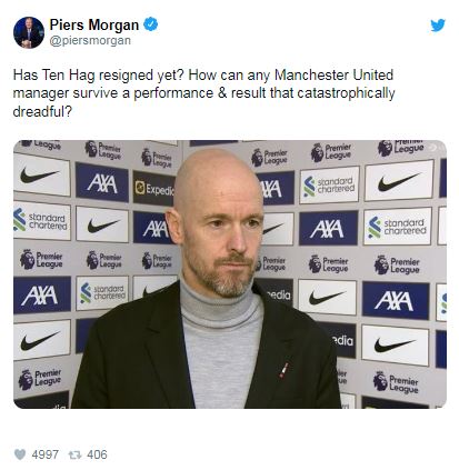 ก่อนปิดท้าย เพียร์ส มอร์แกน ได้ทวิตไปถึง เอริค เทน ฮาก ว่าควรจะลาออก โดยทวิตภาพ โค้ชแมนฯ ยูฯ พร้อมระบุว่า "เทน ฮาก ลาออกหรือยัง? ผู้จัดการทีมแมนเชสเตอร์ ยูไนเต็ด ทุกคนจะอยู่รอดได้อย่างไร กับผลงานและผลการแข่งขันที่น่าสะพรึงกลัว?"