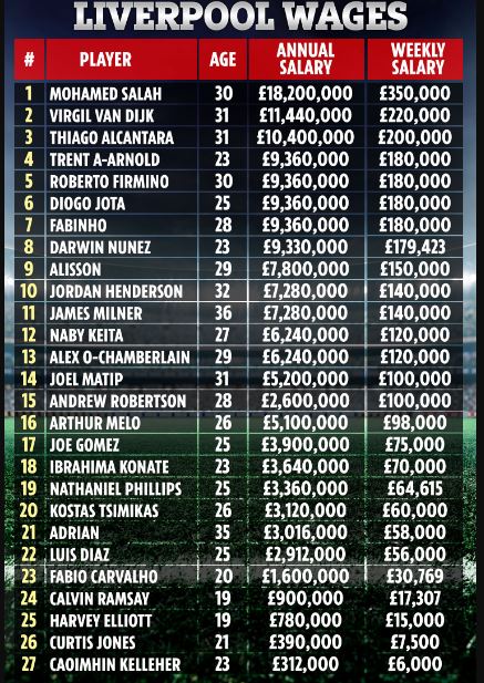 ค่าเหนื่อยนักเตะ ลิเวอร์พูล ฤดูกาล 2022/23 (ปอนด์ต่อสัปดาห์)