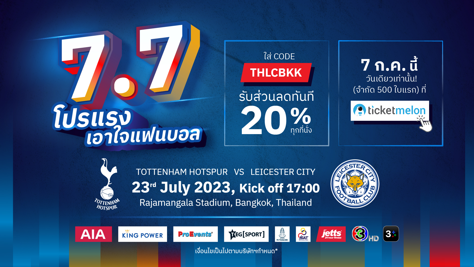 แฟนบอลชาวไทยเฮ! เตรียมปักหมุดรอซื้อตั๋ว ‘สเปอร์ส-เลสเตอร์’ ราคาพิเศษ เพียงใส่ CODE : THLCBKK ผ่านทางเว็บไซต์ Ticketmelon รับส่วนลดทันที 20% ทุกที่นั่ง 7 ก.ค. นี้ วันเดียวเท่านั้น! (จำกัดเพียง 500 ใบแรก)