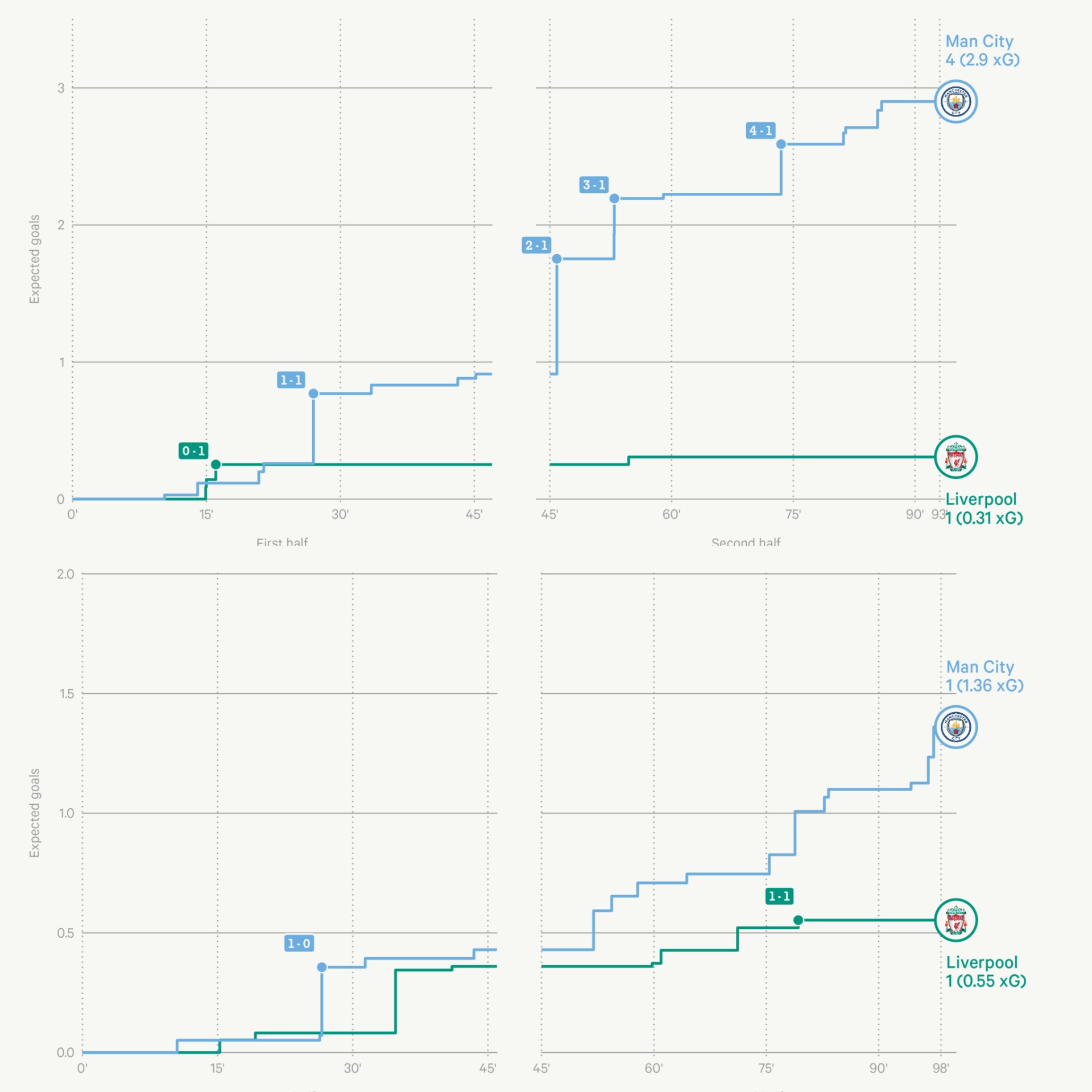 ลิเวอร์พูล ได้ครองบอลแค่ 32 % ขณะที่ ซิตี้ มีโอกาสยิงตรงกรอบถึง 8 หน สวนทางกับ ลิเวอร์พูล ที่ทำได้เพียง 1 ครั้ง