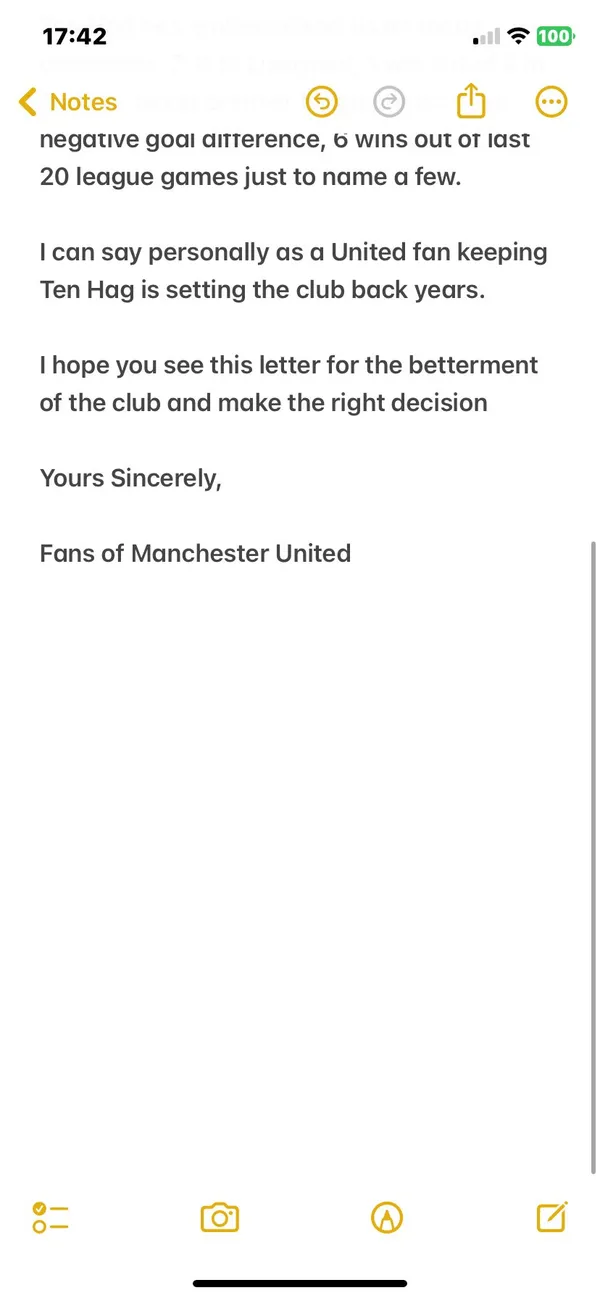 "ผมสามารถบอกได้โดยส่วนตัวว่าในฐานะแฟน ยูไนเต็ด การรั้ง เทน ฮาก จะทำให้สโมสรถอยหลังอีกหลายปี ผมหวังว่าพวกคุณจะเห็นจดหมายฉบับนี้เพื่อสิ่งที่ดีกว่าสำหรับสโมสร และตัดสินใจอย่างถูกต้อง"