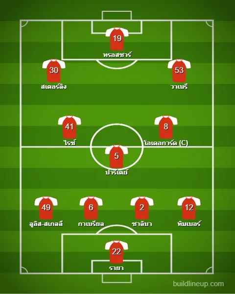 ล่าสุด ไค ฮาแวร์ตซ์ (เจ็บกล้ามเนื้อต้นขา) ปิดเทอมยาวทั้งซีซั่นเรียบร้อย ทำให้ตอนนี้ อาร์เตต้า เหลือตัวเลือกในแดนหน้าแบบกำจัด เพราะทั้ง บูคาโย ซาก้า, กาเบรียล เชซุส และ กาเบรียล มาร์ติเนลลี ต่างก็ยังไม่พร้อม ดังนั้นจึงเป็นโอกาสที่ สเตอร์ลิง จะได้ลงโชว์ฝีเท้าตั้งแต่วินาทีแรกในฐานะตัวรุกฝั่งซ้าย ส่วนด้านขวาเป็นดาวรุ่งพุ่งแรงวัย 17 ปี อย่าง วาเนรี โดยที่มี ทรอสซาร์ รับบทหน้าเป้า