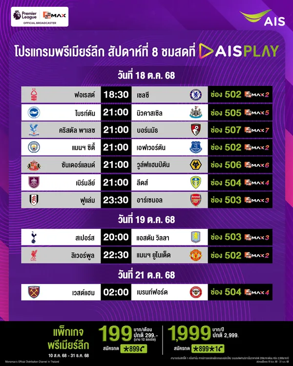 02.00 น. (เช้ามืดอังคารที่ 21 ตุลาคม) เวสต์แฮม พบ เบรนท์ฟอร์ด : AIS PLAY 504 (MONOMAX4)