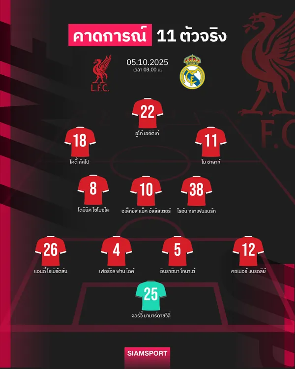 ลิเวอร์พูล ภายใต้การคุมทีมของ อาร์เน่ สล็อต เตรียมเปิดแอนฟิลด์รับการมาเยือน เรอัล มาดริด ในศึกยูฟ่า แชมเปี้ยนส์ ลีก รอบลีกเฟส นัดที่สี่ โดย เคอร์ติส โจนส์ คืนสนามซ้อมแล้ว ส่วน อเล็กซานเดอร์ อิซัค ยังไม่ฟื้นจากอาการเจ็บ คาด “หงส์แดง” ใช้ชุดเดิมจากเกมชนะ แอสตัน วิลล่า ลุยบิ๊กแมตช์ยุโรป