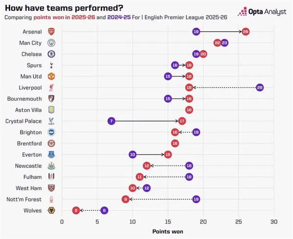 จากข้อมูลของ Opta Analyst ที่เปรียบเทียบคะแนนสะสมของแต่ละทีม พรีเมียร์ลีก (ไม่นับรวม 3 ทีมน้องใหม่อย่าง ซันเดอร์แลนด์, ลีดส์ และ เบิร์นลีย์) หลังผ่าน 11 เกมแรกของฤดูกาล 2025/26 กับฤดูกาล 2024/25 พบเทรนด์ที่น่าสนใจหลายด้าน โดยเฉพาะ ลิเวอร์พูล แชมป์เก่า ฟอร์มตกอย่างน่าใจหาย ส่วน อาร์เซน่อล จ่าฝูงในปัจจุบัน ผลงานดูดีขึ้นเยอะ เมื่อเทียบกับฤดูกาลก่อน และนี่คือบทสรุปของทุกทีม โดยเรียงอันดับจากเพิ่มมากที่สุด → ลดมากสุด