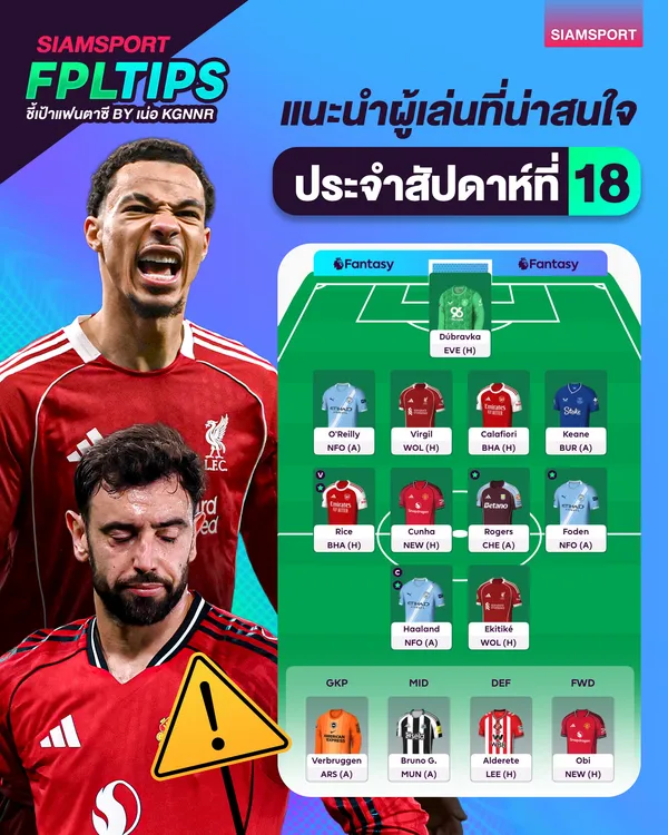 บรูโน่ แฟร์นันด์ส และ อิกอร์ ติอาโก้ ขยับเป็น มาเตอุส คุนญ่า และ อูโก้ เอกิติเก้ ได้ง่ายๆ หงส์แดงและสาลิกาดงตารางดูดีซื้อได้ทั้งสามตำแหน่ง แต่ถ้าซื้อหลังให้เน้น ทอฟฟี่สีน้ำเงิน กัปตันเลือก เออร์ลิ่ง ฮาลันด์ ตามธรรมชาติ แต่ถ้าอยากเสี่ยง อูโก้ เอกิติเก้ ฟอร์มกำลังมา ชิปต้องใช้ให้ครบก่อนจบวีค 19