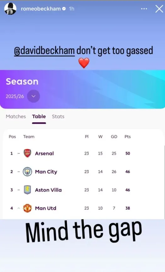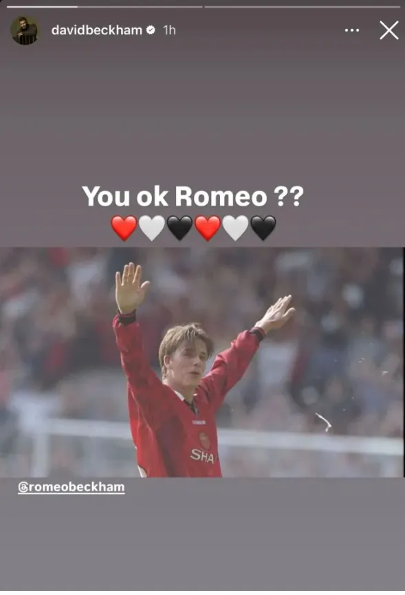 ทั้งนี้ หลังจบเกมนัดล่าสุด เบ็คแฮม ก็โพสต์รูปสมัยที่ตัวเองยังเล่นให้ แมนยูไนเต็ด ลงบน อินสตาแกรม พร้อมพิมพ์ข้อความถึงลูกชายทันทีว่า "โอเคไหมอ่ะ โรเมโอ ??" พร้อมกับใส่อีโมจิหัวใจสีแดง, สีดำ และสีขาวเข้าไปด้วย