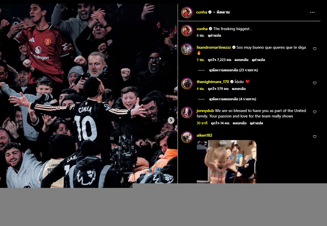 มาเตอุส คุนญ่า แนวรุก แมนเชสเตอร์ ยูไนเต็ด ตะโกนสื่อว่าทีมตัวเองคือทีมที่ยิ่งใหญ่ที่สุดเท่านั้น หลังจากทำประตูชัยให้ทีมบุกไปชนะ อาร์เซน่อล 3-2 ในเกม พรีเมียร์ลีก อังกฤษ นัดล่าสุด