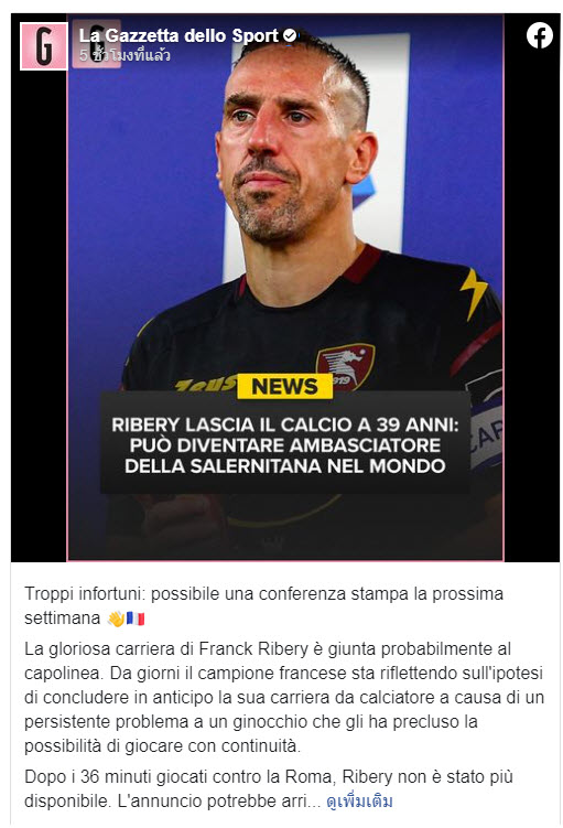 สื่อเลี่ยนปูด ฟร้องค์ ริเบรี่ ปีกดาวดังจอมเก๋า ซาแลร์นิตาน่า เตรียมประกาศรีไทร์ช่วงสัปดาห์หน้า หลังเจอปัญหาบาดเจ็บเล่นงานที่หัวเข่าตั้งแต่ช่วงต้นซีซั่น