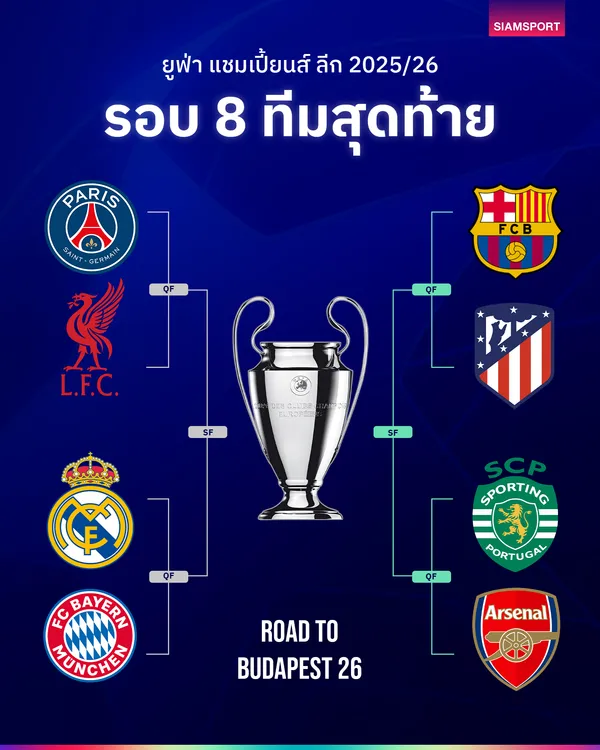สรุปผลจับสลากยูฟ่า แชมเปี้ยนส์ ลีก รอบ 8 ทีมสุดท้าย ได้บิ๊กแมตช์เพียบ "แชมป์เก่า" เปแอสเช ดวล ลิเวอร์พูล ขณะที่ เรอัล มาดริด พบกับ บาเยิร์น มิวนิค รับประกันความมันตั้งแต่คู่แรก