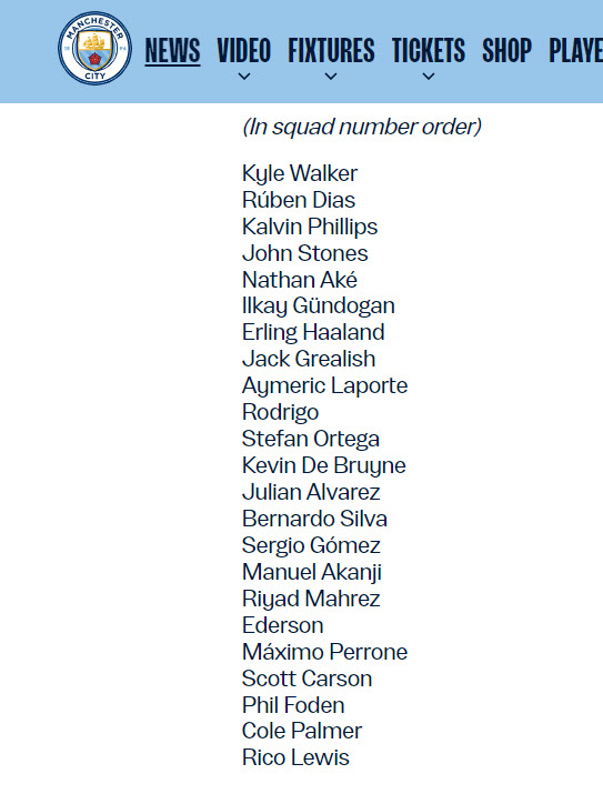 - แนวรุก : เออร์ลิง ฮาลันด์, แจ็ค กรีลิช, ฮูเลียน อัลวาเรซ, ริยาด มาห์เรซ, ฟิล โฟเด้น, โคล พาลเมอร์