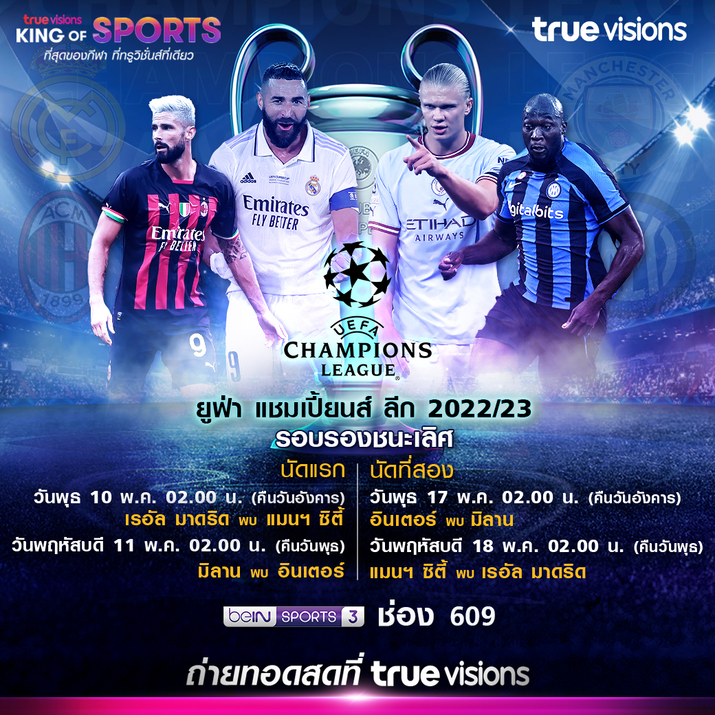 ศึก ยูฟ่า แชมเปี้ยนส์ ลีก 2022/23 รอบรองชนะเลิศ กับ 4 ทีมที่ดีที่สุดของยุโรปในซีซั่นนี้ ถ่ายทอดสดเวลา 02.00 น. ทางทรูวิชั่นส์ ช่อง beIN Sports 3 (609)