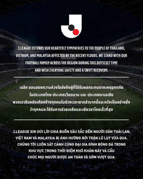 ฝ่ายจัดการแข่งขัน"เจลีก" ฟุตบอลอาชีพญี่ปุ่น โพสต์ข้อความผ่านโซเชียลมีเดียอย่างเป็นทางการ ถึงเหตุการณ์อุทกภัยใหญ่ที่เกิดขึ้นในประเทศไทย,เวียดนาม และ มาเลเซีย พร้อมยืนเคียงข้างทุกคนในช่วงเวลายากลำบากแบบนี้โดยเฉพาะครอบครัวเจลีกขอให้เข้มแข็งและปลอดภัย
