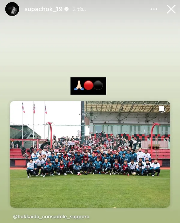 สุภโชค สารชาติ แชร์สตอรี่หลังซ้อมสุดท้ายฤดูกาล พร้อมอิโมจิสีแดง-ดำ ทำแฟนบอลสงสัยอนาคตใน ฮอกไกโด คอนซาโดเล่ ซัปโปโร ก่อนนัดปิดซีซั่นเจลีก 2
