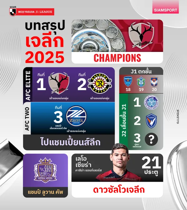 ฟุตบอลเจลีก 2025 ปิดฉากลงไปเป็นที่เรียบร้อยแล้ว "กวางเขาเหล็ก" คาชิม่า แอนท์เลอร์ส ผงาดแชมป์ครั้งแรกในรอบ 9 ปีและเป็นแชมป์สมัยที่ 9 ของสโมสร และนี่คือบทสรุปทั้งหมดของซีซั่นนี้