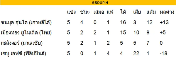 - กรณีคะแนนเท่ากันให้ดูจากผลงานการเจอกัน HEAD TO HEAD (ผล 2 นัดที่พบกันไม่นับอเวย์โกล)