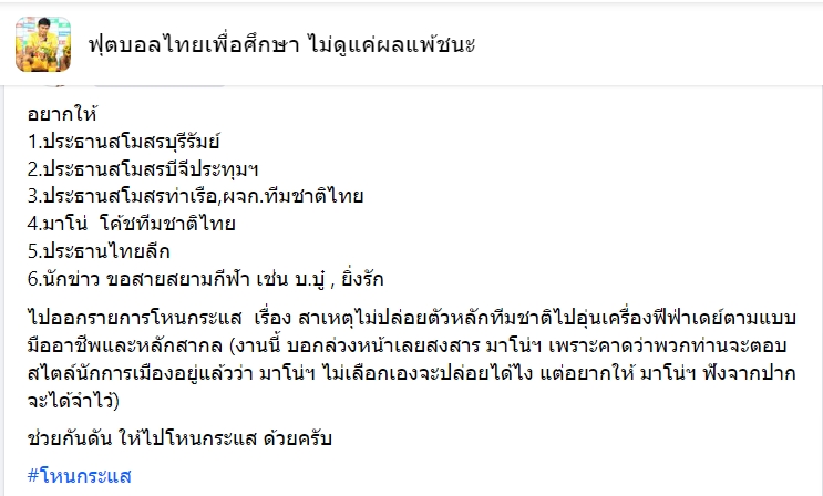 หลากหลายความเห็น หลากหลายคอมเมนต์ของแฟนบอลไทยในโซเชียลกับหลายประเด็นดราม่าที่เกิดขึ้นกับทีมชาติไทยในการเดินทางไปอุ่นเครื่องฟีฟ่าเดย์ที่ยุโรป ล่าสุดมีหนึ่งความเห็นจากแฟนบอลโซเชียลในกลุ่ม FB ที่ใช้ชื่อว่า ฟุตบอลไทยเพื่อศึกษา ไม่ดูแค่ผลแพ้ชนะ ที่ได้โพสต์กับสิ่งที่แฟนบอลหลายท่านอยากให้เกิดขึ้น นั่นก็คือ