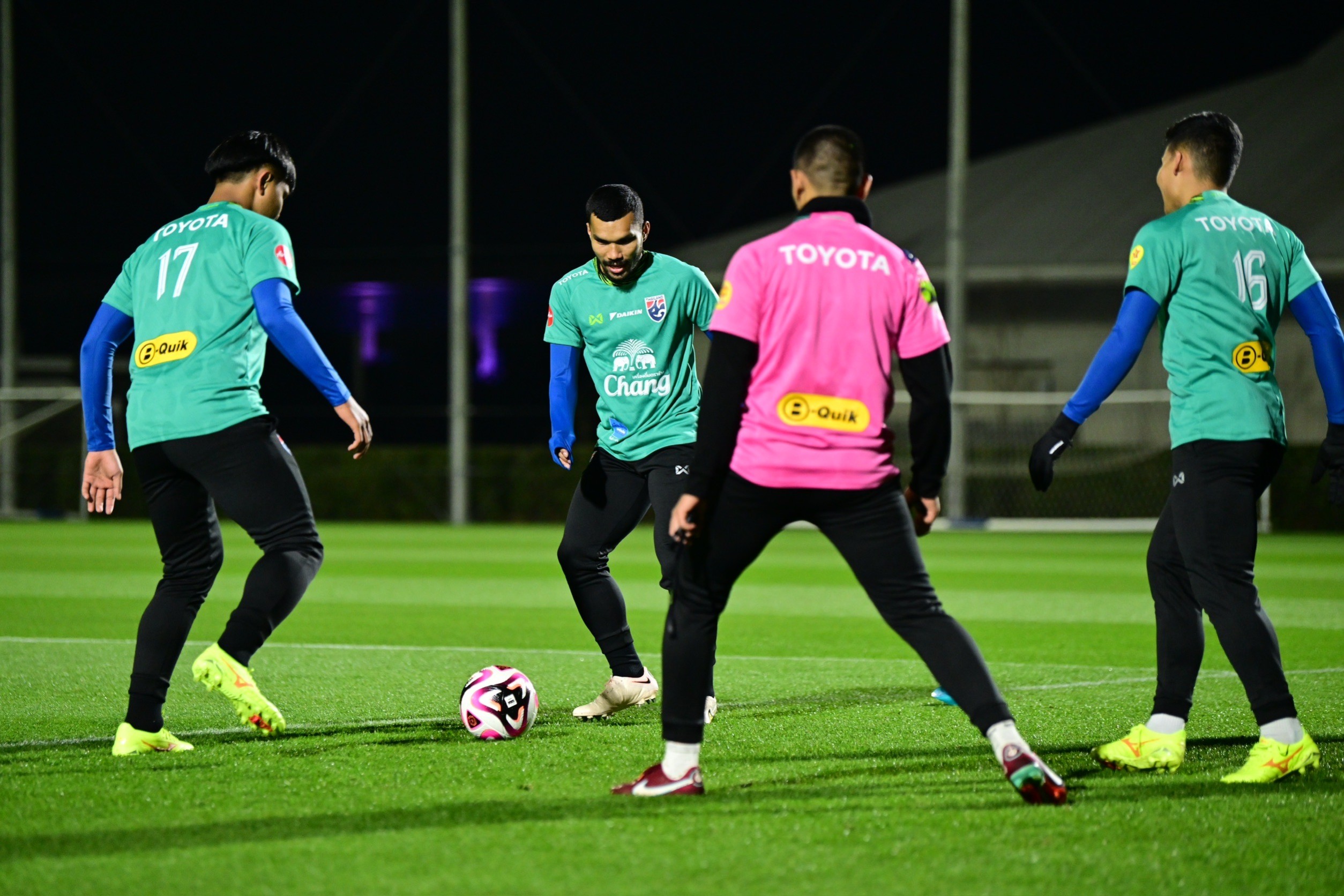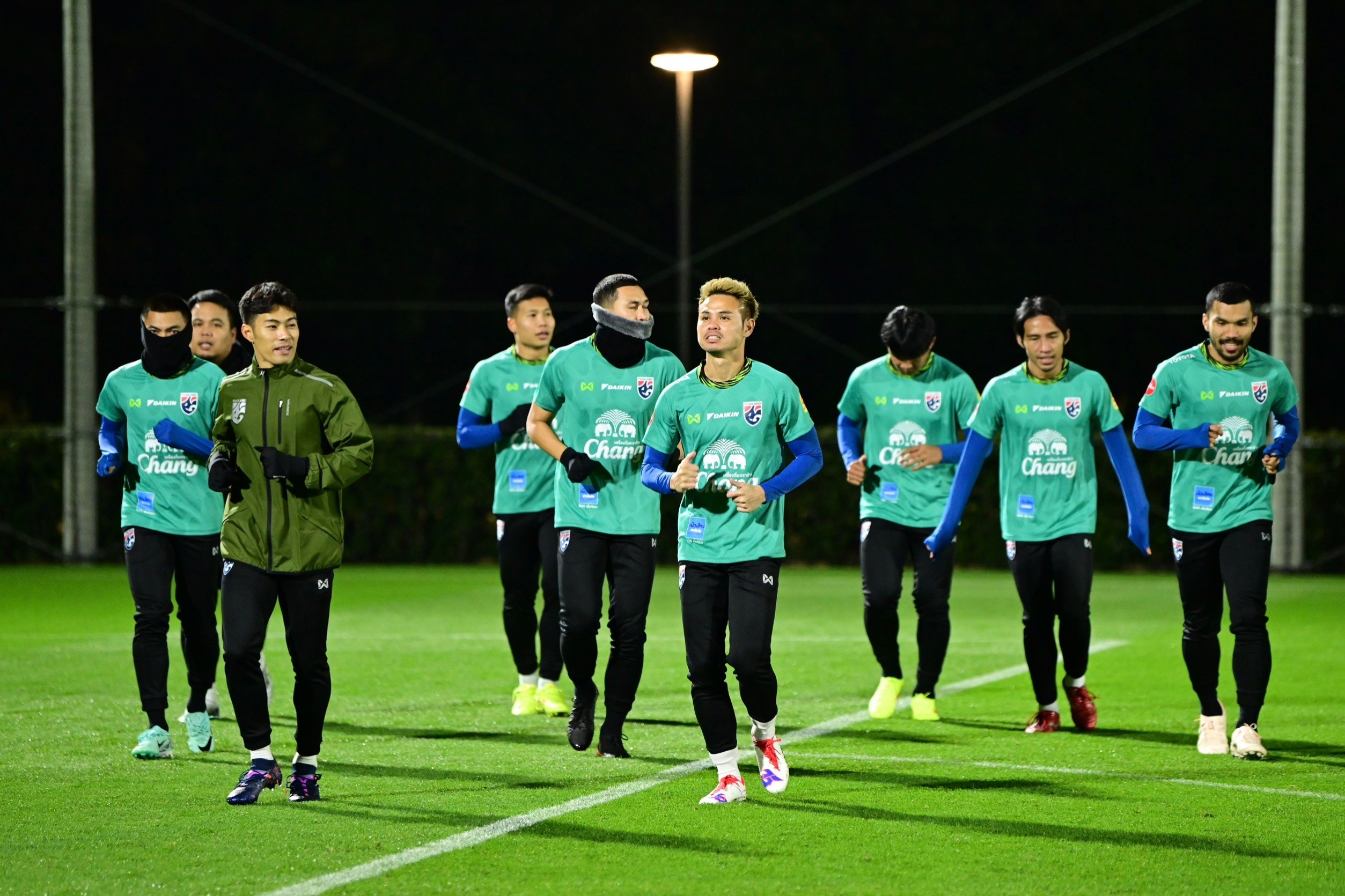 ล่าสุด เมื่อช่วงเย็นวันศุกร์ที่ 29 ธ.ค.2566 เวลา 18.30 น. ตามเวลาท้องถิ่น (เร็วกว่าไทย 2 ชม.) ทัพนักเตะ “ช้างศึก” ทั้ง 23 คนลงฝึกซ้อมเป็นครั้งแรกทันทีหลังจากที่เดินทางถึง ณ สนามเจเอฟเอ ยูเมะ ฟิลด์ มาคุฮาริ ประเทศญี่ปุ่น ภายใต้อุณหภูมิ 10 องศาเซลเซียส ทำให้แข้งไทยต้องสวมเสื้อแขนยาว กางเกงขายาว พร้อมถุงมือในการลงฝึกซ้อม