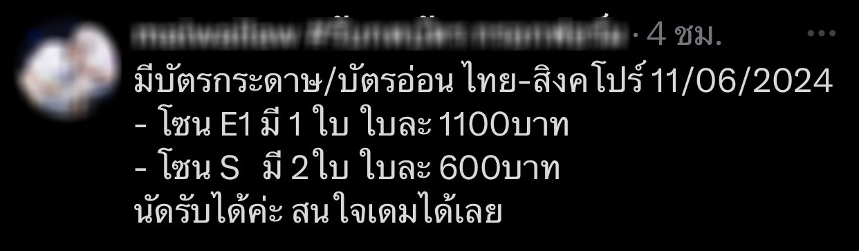 เหตุเกิดจากตั๋วหมด แฟนบอลซื้อไม่ทันเชียร์นัดสำคัญ ทีมชาติไทยซดสิงคโปร์ คัดบอลโลกวันอังคารที่ 11 มิ.ย.นี้ พ่อค้าหัวใสเลยอัพราคาตั๋วพุ่ง 5 เท่า จากเดิมราว 3 ร้อยในโซน E ชั้น 2-3 ฝั่งตรงข้ามมีหลังคา บวกเพิ่มเป็น ‘พันห้า!’ แถมเปิดขายโจ่งแจ้งเต็มโลกออนไลน์ บางคนบอกมีตุนถึง 20 ใบพร้อมปล่อยทันที หากปล่อยหมดรับทรัพย์ 3 หมื่นเน้นๆเข้าเป๋า!!