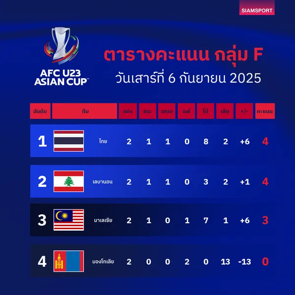 การแข่งขันฟุตบอลรุ่นอายุไม่เกิน 23 ปี ชิงแชมป์เอเชีย 2026 รอบคัดเลือก กลุ่ม เอฟ ที่สนามธรรมศาสตร์ รังสิต กำลังเข้มข้น โดยในนัดสุดท้ายวันอังคารที่ 9 กันยายน 2568 ยังมีสามทีมที่ลุ้นเข้ารอบสุดท้าย ประกอบด้วย ทีมชาติไทย, ทีมชาติเลบานอน และทีมชาติมาเลเซีย