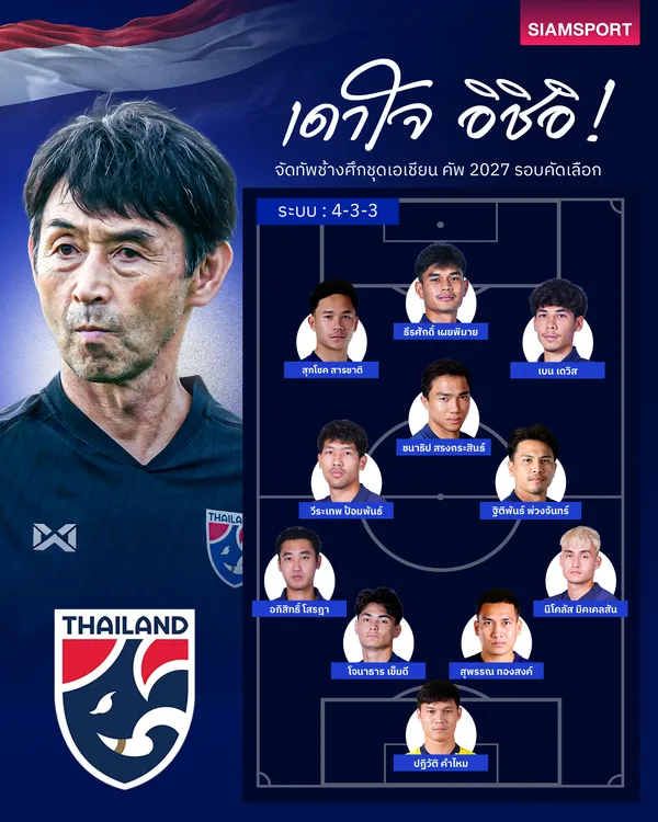 คาด 11 ตัวจริง “ทีมชาติไทย” เกมคัดเอเชียน คัพ 2027 พบ “ไต้หวัน” วันที่ 9 และ 14 ต.ค. 2568 - มาซาทาดะ อิชิอิ เตรียมจัดเต็มนำโดย ชนาธิป สรงกระสินธ์, สุภโชค สารชาติ, ธีรศักดิ์ เผยพิมาย พร้อมแผน 4-3-3 ล่าชัยสองนัดสำคัญ