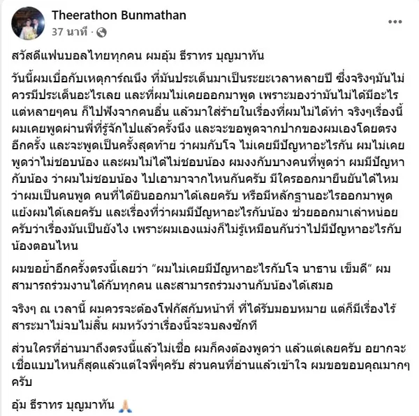 ธีราทร บุญมาทัน ชี้แจงผ่านโซเชียลส่วนตัว ยืนยันไม่เคยมีปัญหากับ โจนาธาร เข็มดี ตามที่ถูกพูดถึงมาหลายปี พร้อมย้ำสามารถร่วมงานกันได้ทุกเมื่อ หวังให้กระแสนี้ยุติลง ขณะเตรียมลุยทีมชาติไทยในยุค แอนโธนี ฮัดสัน ช่วงฟีฟ่า เดย์ พฤศจิกายนนี้