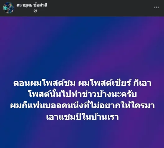 “ตอนผมโพสต์ชม ผมโพสต์เชียร์ ก็เอาโพสต์นั้นไปทำข่าวบ้างนะครับ ผมก็แฟนบอลคนนึงที่ไม่อยากให้ใครมาเอาแชมป์ในบ้านเรา”