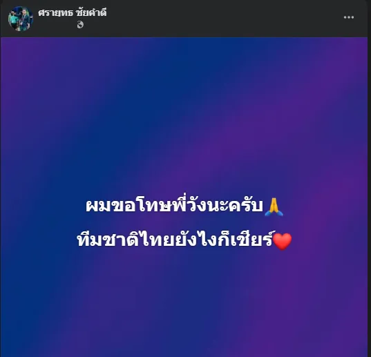 "ผมขอโทษพี่วังนะครับ(อิโมจิไหว้) ทีมชาติไทยยังไงก็เชียร์ (อิโมจิหัวใจ)