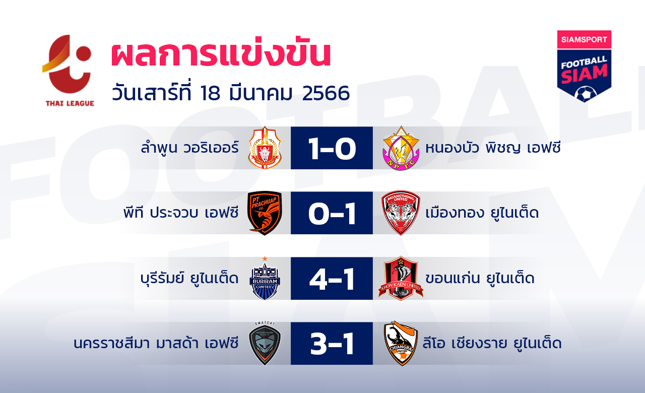 บุรีรัมย์ นำจ่าฝูงโด่งหลังถล่ม ขอนแก่น ยูฯ ด้าน เมืองทอง ยูไนเต็ด ขึ้นที่ 3 เฉือนชนะ พีที ประจวบ ส่วน นครราชสีมา มาสด้า ซิวชัย 3 นัดรวด ทุบ ลีโอ เชียงราย ขณะที่ ลำพูน เปิดรังดับ หนองบัวพิชญ สรุปผลบอลไทยลีก 1 พร้อมตารางคะแนน และ ผลบอลไทยลีก 2 ฤดูกาล 2022-23 ประจำวันเสาร์ที่ 18 มีนาคม 2566