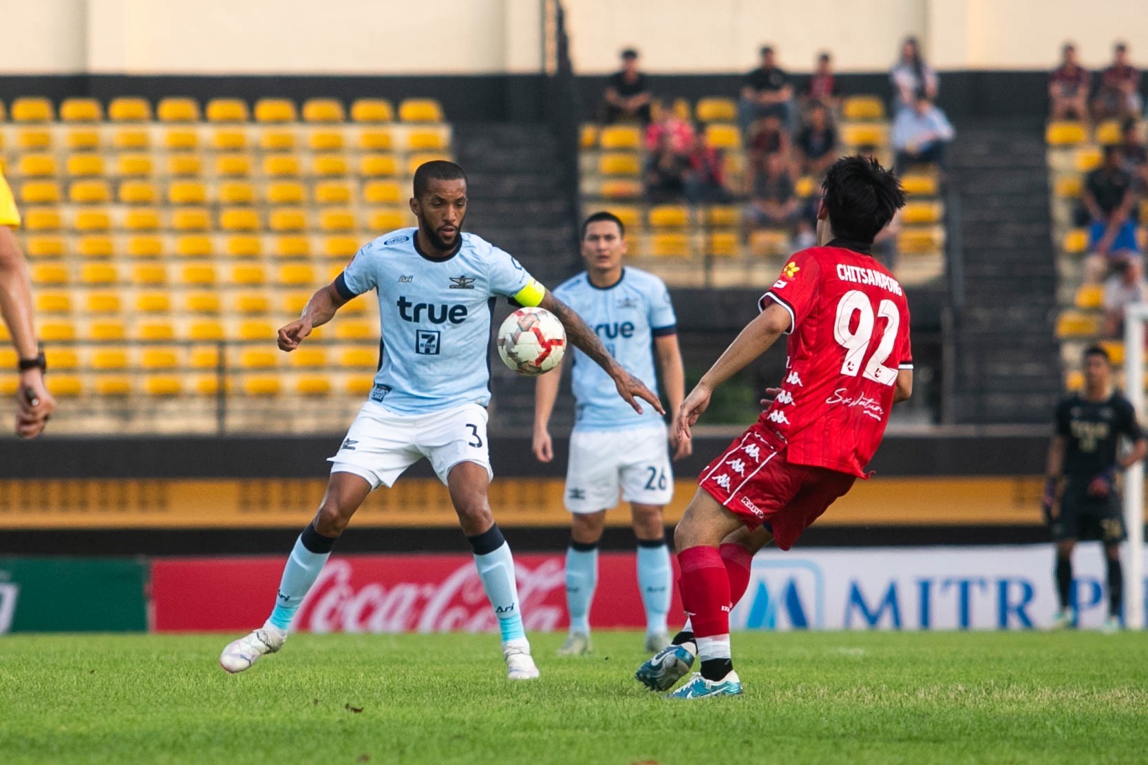 น.27 ทรู แบงค็อกฯ ได้ประตูบุกนำเจ้าถิ่นจากการทุ่มบอลริมขวา ก่อนที่ วิลเล่น โมต้า จะแปะบอลให้ มามูด เอจ ไหลต่อเข้าทางกลางให้ ทศวรรษ ลิ้มวรรณเสถียร กดด้วยขวาไม่จับที่นอกกรอบ บอลพุ่งเสียบหน้าต่างเสาไกลเข้าไปอย่างสวยงาม ทรู แบงค็อกฯ บุกนำ 1-0