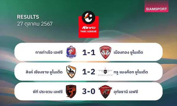 สรุปผลบอลไทยลีก 1 พร้อมตารางคะแนน และไทยลีก 2 ฤดูกาล 2024-25 วันอาทิตย์ที่ 27 ต.ค.67 การท่าเรือ เจ๊า เมืองทอง, ทรู แบงค็อก บุกเฉือน สิงห์ เชียงราย ขณะที่ พีที ประจวบ อัด อุทัยธานี