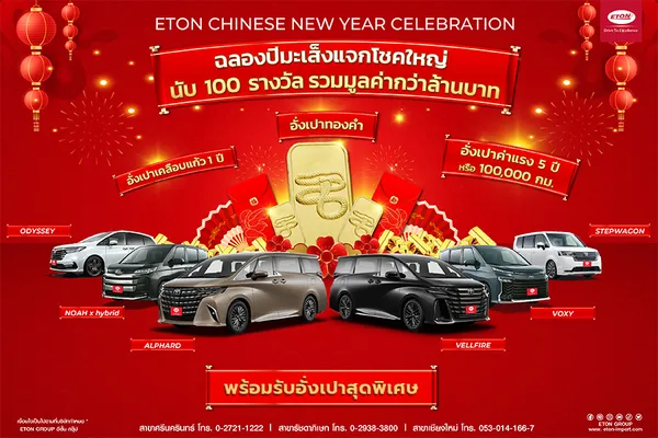 ฉลองตรุษจีนนี้ ETON GROUP ขอมอบอั่งเปาพิเศษ ต้อนรับปีมงคลกับแคมเปญ “ETON CHINESE NEW YEAR CELEBRATION” ออกรถกับอีตั้น ตลอดแคมเปญนี้ จองปุ๊บ รับอั่งเปาทุกคัน รางวัลใหญ่ รับทองคำแท่งมูลค่า 1 บาท / เคลือบแก้วฟรี 1 ปี / ฟรีค่าแรงเปลี่ยนถ่ายน้ำมันเครื่อง 5 ปี หรือ 100000 กม. และรางวัลมากมายกว่า 100 รางวัล รวมมูลค่ากว่าล้านบาท สิทธิพิเศษจองก่อน เฮงก่อน เพียงแค่…วางเงินจอง มูลค่า 200,000 บาทขึ้นไป