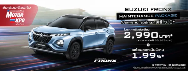 ซูซูกิ อัดแคมเปญรับ Motor Expo 2025 สุดเร้าใจ รับสิทธิ์ซื้อ SUZUKI FRONX MAINTENANCE PACKAGE นาน 7 ปี มอบสิทธิประโยชน์ในราคาเริ่มต้นเพียง 2,990 บาท เท่านั้น เมื่อจอง ALL NEW SUZUKI FRONX เติมเต็มทุกความคุ้มค่า ยกระดับทุกความมั่นใจ
