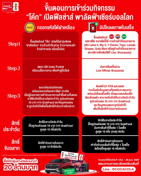 - ช่องทางที่ 2: อัปโหลดใบเสร็จ พาลุ้นโชค เพียงซื้อผลิตภัณฑ์ “โค้ก” “แฟนต้า” หรือ “สไปรท์” รสชาติใด ขนาดใดก็ได้ จากร้านค้าที่ร่วมรายการ (เช่น 7-Eleven, Lotus’s, Big C, Tops, Grab Mart ฯลฯ) จากนั้นอัปโหลดภาพใบเสร็จและกรอกข้อมูลผ่าน LINE Official Account @cocacola ตามขั้นตอนที่จะได้รับแจ้งทาง LINE ต่อไป (เมื่อสำเร็จตามขั้นตอน จะได้รับสิทธิ์รับรางวัลประจำวันเป็นคูปองส่วนลด 10 บาท จาก Grab โดยคูปองส่วนลดจะถูกส่งผ่าน LINE Official Account @cocacola หลังจากใบเสร็จได้รับการตรวจสอบและยืนยันเรียบร้อยแล้ว)