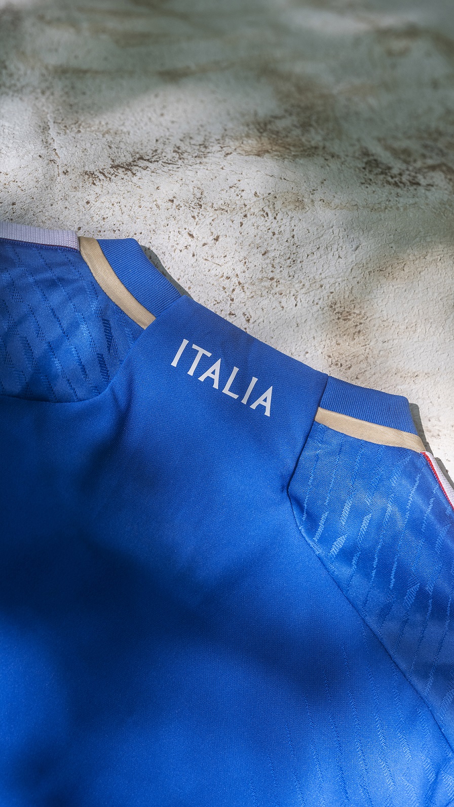 สำหรับชุดแข่งขัน "ทีมเหย้า" ทั้งเสื้อแข่งขันและกางเกงขาสั้น มาในดีไซน์สีน้ำเงินพร้อมกับลวดลายหินอ่อน ด้วยการผสานเทคนิคงานฝีมือแบบดั้งเดิมเข้ากับนวัตกรรมอันล้ำสมัย พร้อมเสริมรายละเอียดเพื่อสะท้อนวัฒนธรรมอิตาลีลงไปอย่างแยบยล ทั้งการเพิ่มเส้นขอบสามสีของธงชาติอิตาลีลงบนสัญลักษณ์สามแถบของอาดิดาสบริเวณหัวไหล่ ด้านข้าง และขอบเสื้อ นอกจากนี้ตรงบริเวณด้านหลังคอเสื้อยังมีการสกรีนคำว่า ”Italia” ในสไตล์โรมัน เช่นเดียวกับที่ใช้ในการสกรีนชื่อผู้เล่นและหมายเลขเสื้อ ดีไซน์บริเวณแขนเสื้อและคอเสื้อที่ตกแต่งด้วยลายเส้นสีทอง เพื่อสะท้อนถึงความสำเร็จของสหพันธ์ฟุตบอลอิตาลี โดยมีโลโก้อาดิดาสและโลโก้ตราสัญลักษณ์สหพันธ์ฟุตบอลอิตาลีที่เปิดตัวล่าสุดได้ถูกจัดวางบริเวณตรงกลางเสื้อด้วยการสกรีนด้วยความร้อนบริเวณหน้าอก