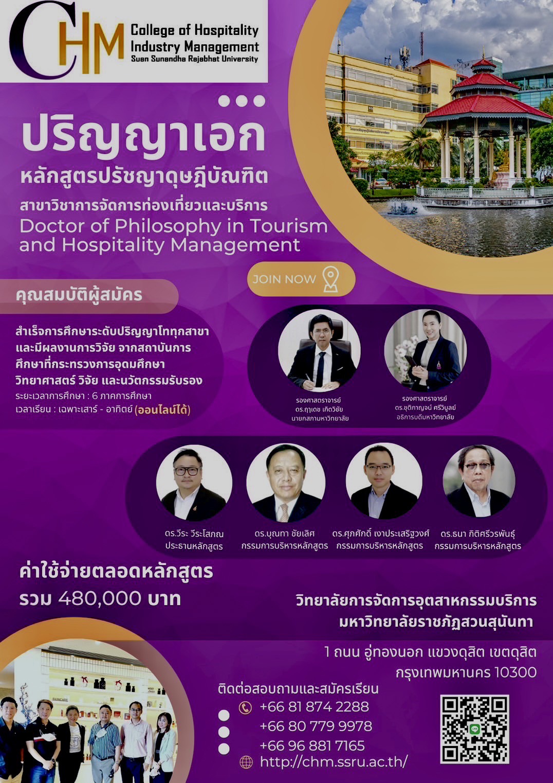 มหาวิทยาลัยราชภัฏสวนสุนันทา เปิดรับสมัครเรียนต่อ ป.โท หลักสูตรศิลปศาสตรมหาบัณฑิต สาขาการจัดการท่องเที่ยวและบริการ โดยเรียน 4 เทอมจบ ส่วน ป.เอก เป็นหลักสูตรปรัชญาดุษฎีบัณฑิต สาขาการจัดการท่องเที่ยวและบริการ เรียน 6 เทอมจบ ซึ่งสามารถดูข้อมูลเพิ่มเติมได้ที่ https://admission.ssru.ac.th/isqy01 และสมัครง่ายได้ๆ ที่เบอร์โทร 0818742288, 0993265445, 0804428991