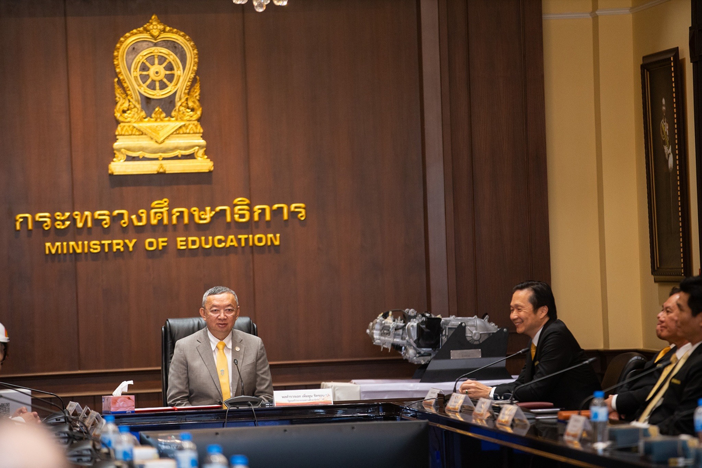 นายพงศธร เอื้อมงคลชัย ประธานกรรมการบริหาร พร้อมด้วย มร.ฮิเดฮิโกะ ทาคากิ รองประธานกรรมการบริหาร, นายภาณุพล กิตติคำรณ ผู้จัดการใหญ่ด้านการค้า, นายอุกฤษณ์ ภาควิวรรธ รองผู้จัดการใหญ่ด้านวางแผนการค้าและการตลาด จากบริษัทไทยยามาฮ่ามอเตอร์ จำกัด ร่วมกันมอบหมวกนิรภัยขนาดเล็กที่ได้มาตรฐาน มอก. จำนวน 7,700 ใบ และเครื่องยนต์เพื่อการศึกษา ขนาด 300 ซีซี ระบบส่งกำลังด้วยระบบสายพาน จำนวน 100 เครื่อง ให้กับกระทรวงศึกษาธิการ โดยมี พล.ต.อ.เพิ่มพูน ชิดชอบ รัฐมนตรีว่าการกระทรวงศึกษาธิการ พร้อมด้วย ว่าที่ ร.ต.ธนุ วงษ์จินดา เลขาธิการคณะกรรมการการศึกษาขั้นพื้นฐาน และนายยศพล เวณุโกเศศ เลขาธิการคณะกรรมการการอาชีวศึกษา ร่วมกันรับมอบที่กระทรวงศึกษาธิการ