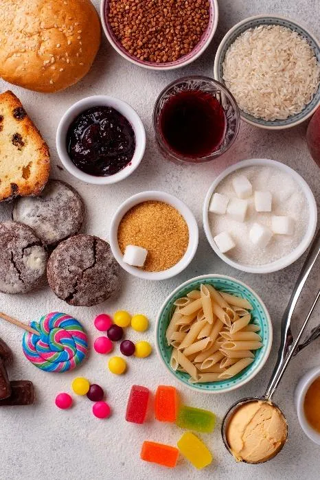 - ควรจำกัดคาร์บเชิงเดี่ยว โดยเฉพาะน้ำตาลที่เติมในอาหาร เพราะการบริโภคมากเกินไปเสี่ยงต่อโรคอ้วน เบาหวาน
