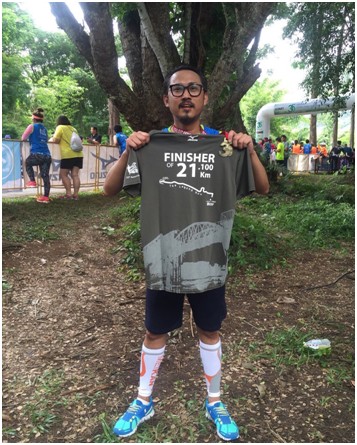 “จู่ ๆ ปวดหลังมาก แทบนั่งไม่ได้ ต้องยืน คิดว่าเกิดจากนั่งทำงานท่าเดียวนานๆ เลยลองกลับมาวิ่ง พอวิ่งก็หายปวดหลัง ตั้งแต่นั้นก็วิ่งอย่างสม่ำเสมอ แต่คราวนี้จริงจังขึ้น มีเป้าหมาย ลงสมัครแข่งสนามแรก 21 กิโลเมตร ตอนนั้นคิดว่า ถ้าไม่ไหวก็จะเดิน จำได้ว่า ตอนเข้าเส้นชัยสำเร็จรู้สึกฟินมาก แต่วันต่อมาก็แทบเดินไม่ได้ เพราะตอนนั้นยังไม่ได้ซ้อมอย่างมีระบบ”