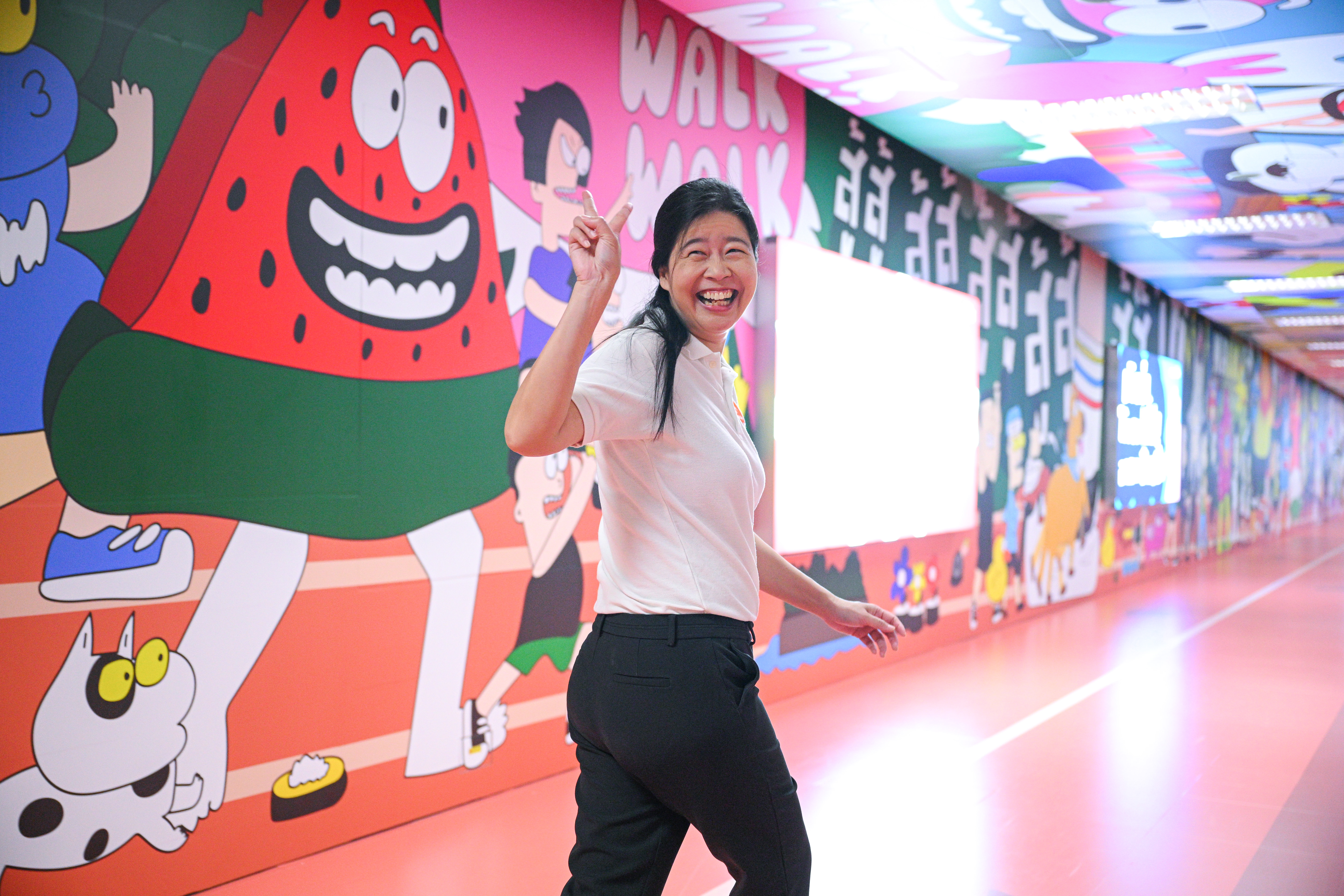 สิ่งนี้ทำให้อุโมงค์ ‘เดินฟาสต์ให้ร่างฟิต’ ถูกออกแบบเป็นโลกเหนือจินตนาการ อัดแน่นไปด้วยเหล่ามอนสเตอร์ไม่ซ้ำหน้า และไม่ลืมที่จะใส่คนแต่ละอาชีพ รวมถึงสิ่งของต่างๆ ประกอบจนเต็มพื้นที่ เขายอมรับว่า หากมองเผินๆ คงเห็นความยุ่งเหยิงอยู่เต็มไปหมด แต่นั่นคือความตั้งใจ เพราะอยากให้คนดูรู้สึกสนุกที่จะมองและจินตนาการว่าตัวการ์ตูนที่เห็นคือตัวอะไร เพื่อดึงดูดให้คนที่เดินผ่านอยู่ในอุโมงค์มีความรู้สึกร่วมว่าพวกเขากำลังกาย